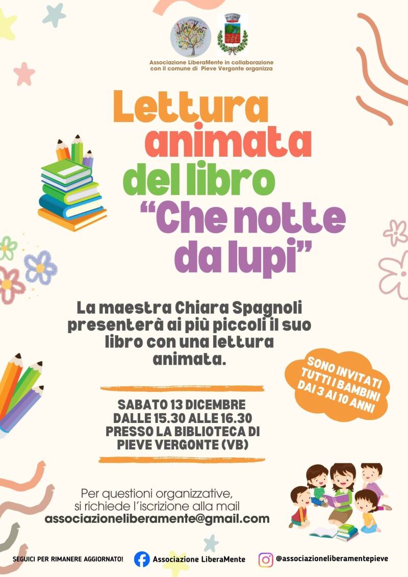 L’Associazione LiberaMente, in collaborazione con il Comune di Pieve Vergonte, propone un nuovo appuntamento pensato per far brillare la fantasia dei più piccoli: una lettura animata del libro “Che notte da lupi”, interpretata e presentata dall’autrice, la maestra Chiara Spagnoli.